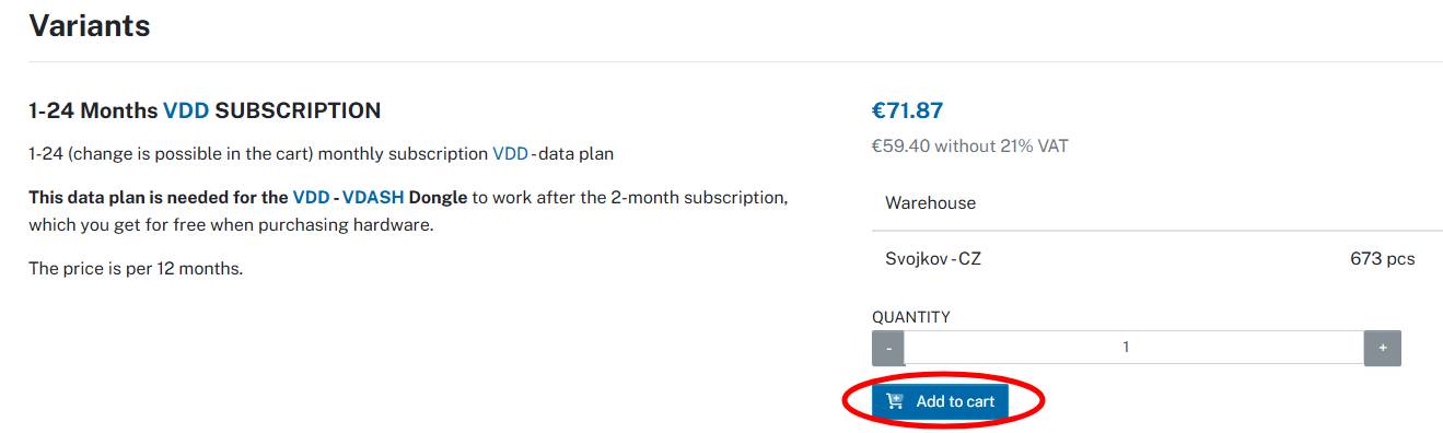 Open the product detail VDD - Volvo function extender and in the Variants section you will find the item 1–24 Months VDD SUBSCRIPTION -> Add to cart