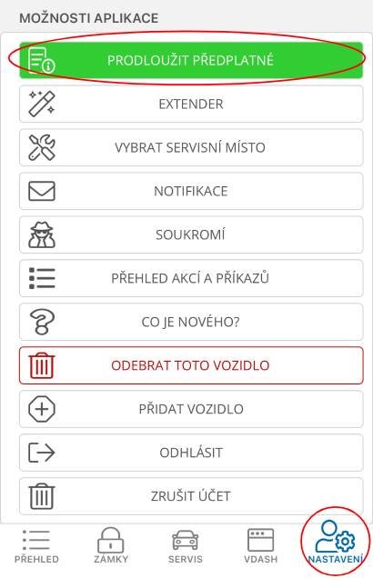 V aplikaci vyberte Nastavení ->Prodloužit předplatné
